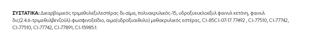 Συστατικά: Di-Hema Trimethylhexyl Dicarbamate, Polyacrylate-15, Hydroxycyclohexyl Phenyl Ketone, Phenylbis(2,4,6-trimethylbenzoyl) phosphine oxide, 2-Hydroxyethyl methacrylate, CI-17200, CI-15850, CI-77499, CI-77492, CI-77510, CI-77742, CI-77510, CI-77742, CI-77891, CI-15985:1
