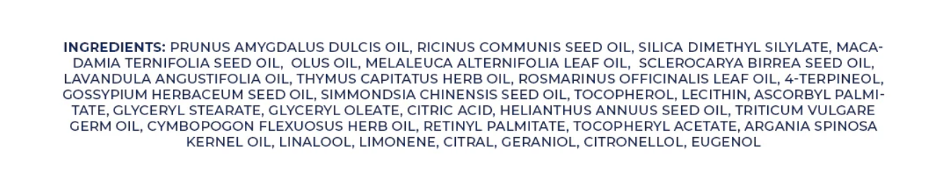 prunus amygdalus dulcis oil, ricinus communis seed oil, silica dimethyl silylate, macadamia ternifolia seed oil, olus oil, melaleuca alternifolia leaf oil, sclerocaryabirrea seed oil, lavandula angustifolia oil, thymus capitatus herb oil, rosmarinus officinalis leaf oil, 4-terpineol, gossypium herbaceum seed oil, simmondsia chinensis seed oil, tocopherol, lecithin, ascorbyl palmitate, glyceryl stearate, glyceryl oleate, citric acid, helianthus annuus seed oil, triticum vulgare germ oil, cymbopogon flexuosus herb oil, retinyl palmitate, tocopheryl acetate, argania spinosa kernel oil, linalool, limonene, citral, geraniol, citronellol, eugenol