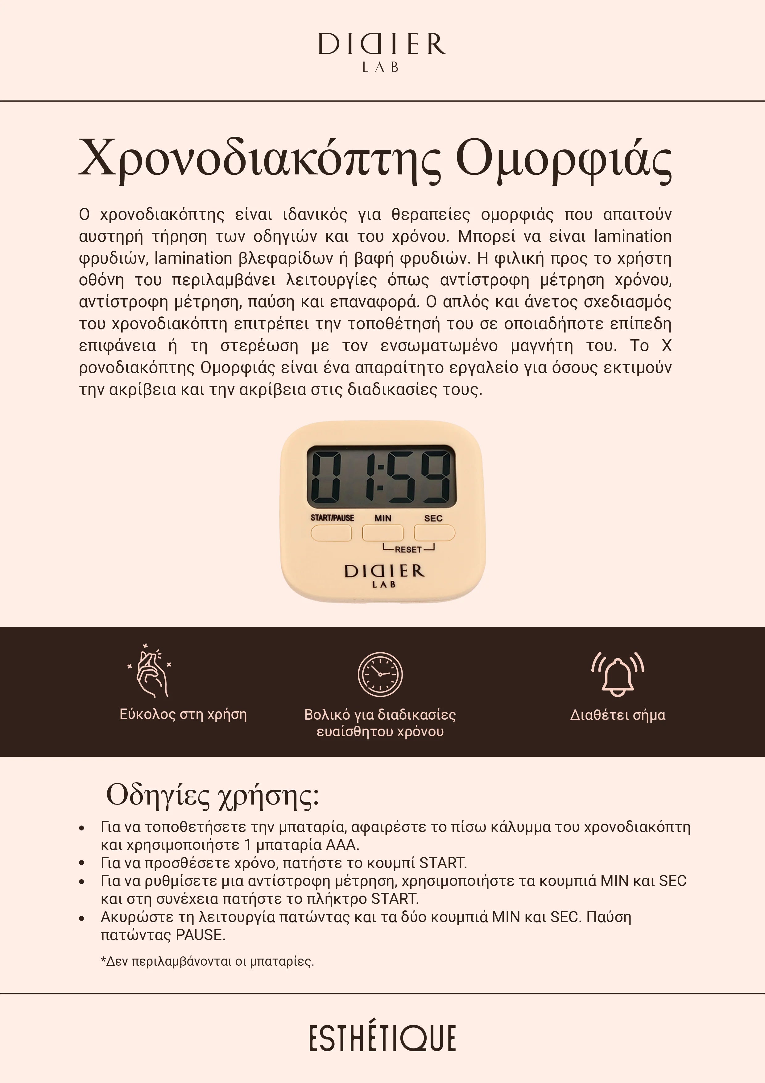 Ανακαλύψτε το beuty timer χρονόμετρο - το απαραίτητο εργαλείο σας για τέλειο lamination φρυδιών! Με το καινοτόμο χρονόμετρο μας, το styling φρυδιών γίνεται παιχνιδάκι.