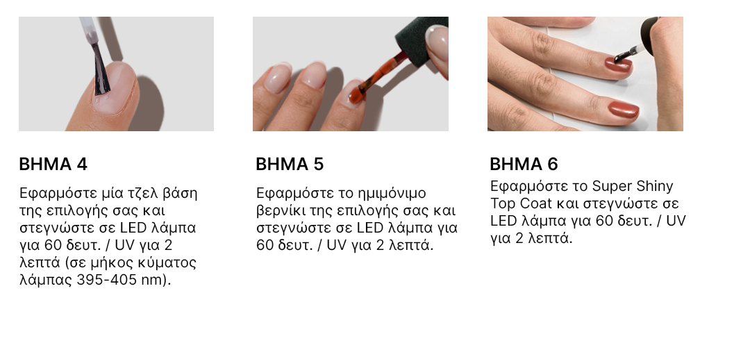 - Εφαρμόστε το top coat Super Shiny και πολυμερίστε σε λάμπα LED για 60 δευτερόλεπτα / UV για 2 λεπτά.