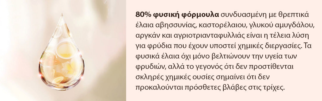 Επιτρέψτε μας να σας παρουσιάσουμε μια ισχυρή και 80% φυσική σύνθεση που έχει σχεδιαστεί για την ενυδάτωση και την αναζωογόνηση των φρυδιών. Αυτό το μοναδικό λάδι περιποίησης είναι κατασκευασμένο από ένα μείγμα θρεπτικών ελαίων λιναρόσπορου, αργκάν, τριανταφυλλιάς και αβησσυνίας, μαζί με τον πλούτο των ελαίων γλυκού αμυγδάλου που είναι γεμάτα με απαραίτητα λιπαρά οξέα. Αυτά τα συστατικά επηρεάζουν σημαντικά τον μεταβολισμό της τρίχας παρέχοντας έντονη υγρασία, αναγέννηση, καταπραϋντικές ιδιότητες, ακόμη και προστατευτικά οφέλη στο δέρμα μετά την πλαστικοποίηση των φρυδιών. Επιπλέον, αυτό το φυσικό μείγμα κάνει θαύματα στην πρόληψη της ξηρότητας και της ευθραυστότητας των τριχών των φρυδιών, ενώ ταυτόχρονα προάγει τη δύναμή τους με τη βοήθεια της βιταμίνης Ε, ελαχιστοποιώντας αποτελεσματικά την τριχόπτωση.
