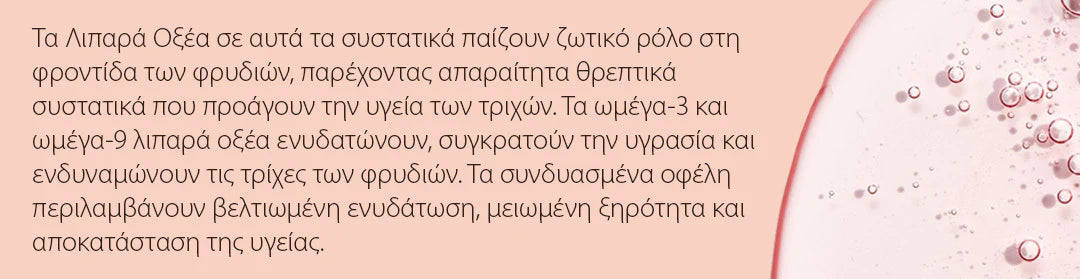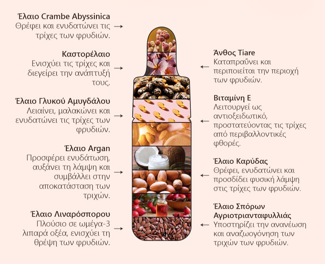 Τα λιπαρά οξέα που υπάρχουν σε αυτά τα συστατικά παίζουν ζωτικό ρόλο στη φροντίδα των φρυδιών, παρέχοντας απαραίτητα θρεπτικά συστατικά και προάγοντας τη συνολική υγεία των μαλλιών. Τα ωμέγα-3 και ωμέγα-9 λιπαρά οξέα συμβάλλουν στην ενυδάτωση, τη διατήρηση της υγρασίας και την ενδυνάμωση των τριχών των φρυδιών. Τα συνδυασμένα οφέλη περιλαμβάνουν βελτιωμένη ελαστικότητα, μειωμένη ξηρότητα και γυαλιστερή, αναζωογονημένη εμφάνιση, καθιστώντας τα απαραίτητα για τη διατήρηση υγιών και θρεπτικών φρυδιών.