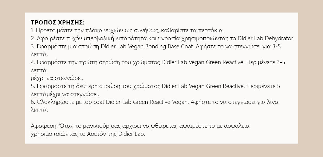 Ολοκληρώστε την εφαρμογή με μια λεπτή στρώση Didier Lab Green Reactive Vegan Top Coat . Αφήστε το να στεγνώσει για λίγα λεπτά.