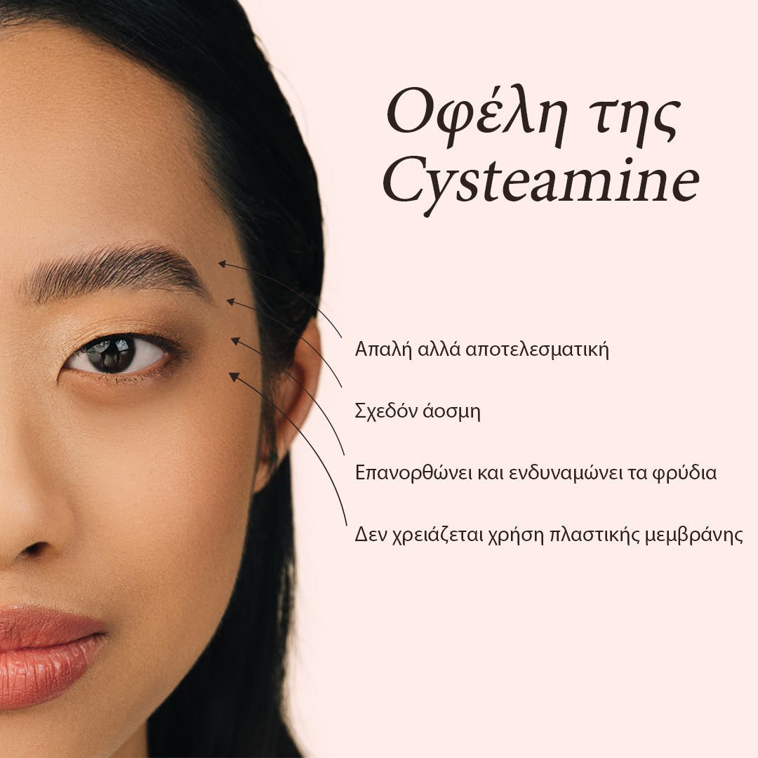 Η φόρμουλα με κυστεαμίνη έχει την ικανότητα να σπάει τους δισουλφιδικούς δεσμούς των τριχών. Σε αντίθεση με άλλα προϊόντα που χρησιμοποιούν θειογλυκολάτη, το δικό μας σύστημα lamination φρυδιών βοηθά στην επίτευξη των καλύτερων αποτελεσμάτων χωρίς ζημιά στις τρίχες. Η κυστεαμίνη ελαχιστοποιεί την πιθανότητα υπερεπεξεργασίας ενώ θρέφει και ενισχύει τους δεσμούς της τρίχας.