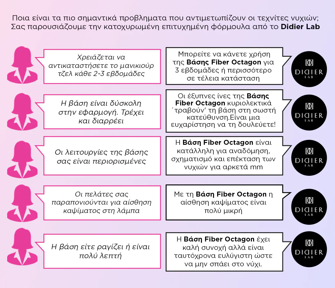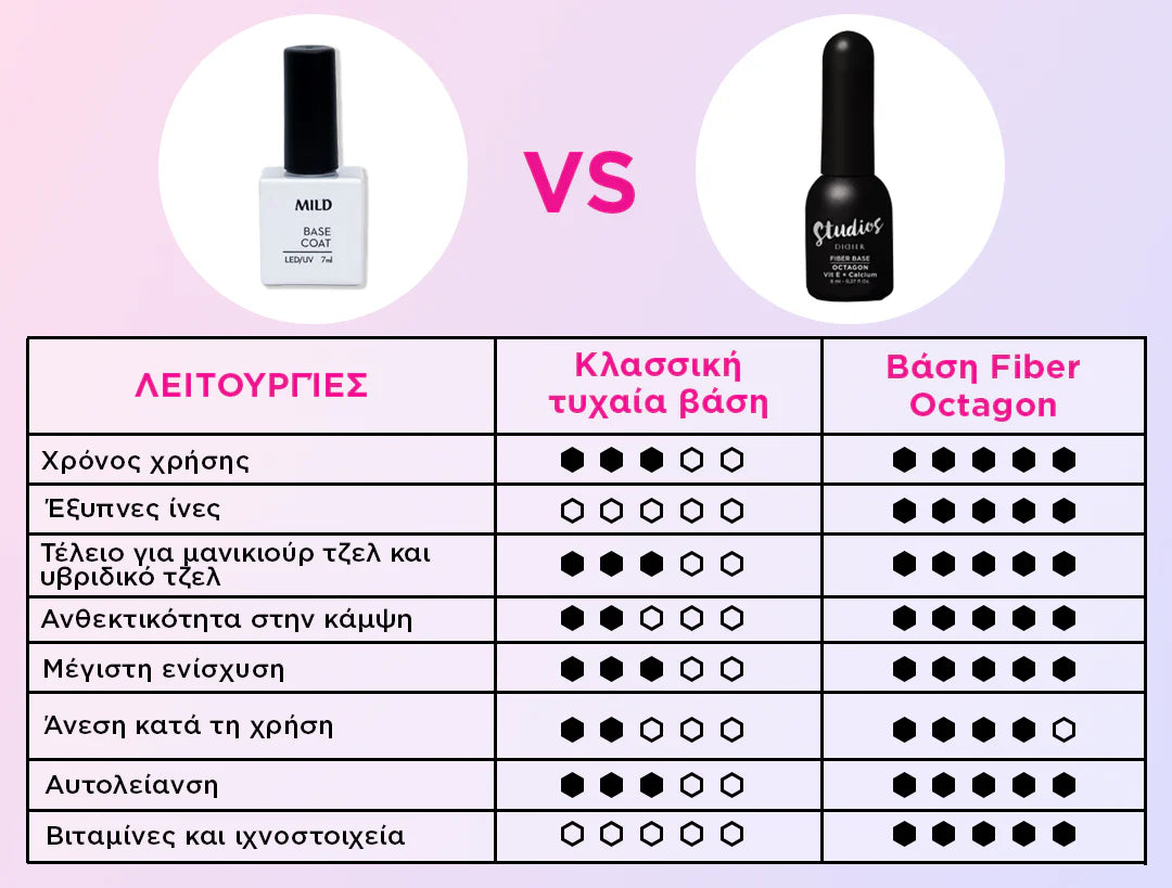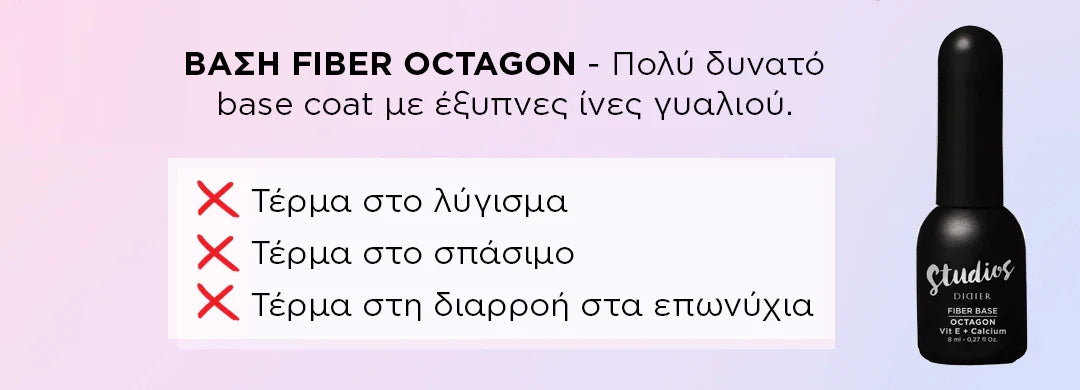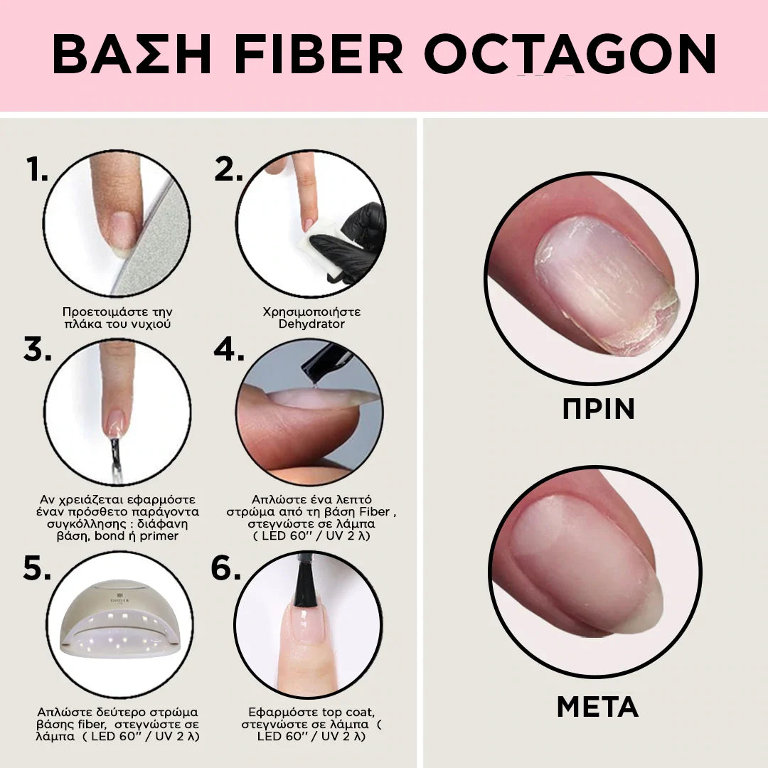 Η Fiber Base Octagon διαθέτει μια ειδικά κατοχυρωμένη φόρμουλα που ανταποκρίνεται στα πιο σημαντικά ζητήματα των επαγγελματιών του μανικιούρ: