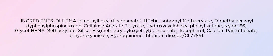 Συστατικά: Polyurethane-57, Hydroxypropyl Methacrylate, Isobornyl Methacrylate, Cellulose Acetate Butyrate, Hydroxycyclohexyl Phenyl Ketone, Ethyl Trimethylbenzoyl Phenylphosphinate, Glycol Hema-Methacrylate, Silica, Nylon-66, Bis(methacryloyloxyethyl) Phosphate, Tocopherol, Calcium Pantothenate, P-Hydroxyanisole, Hydroquinone, CI 77891