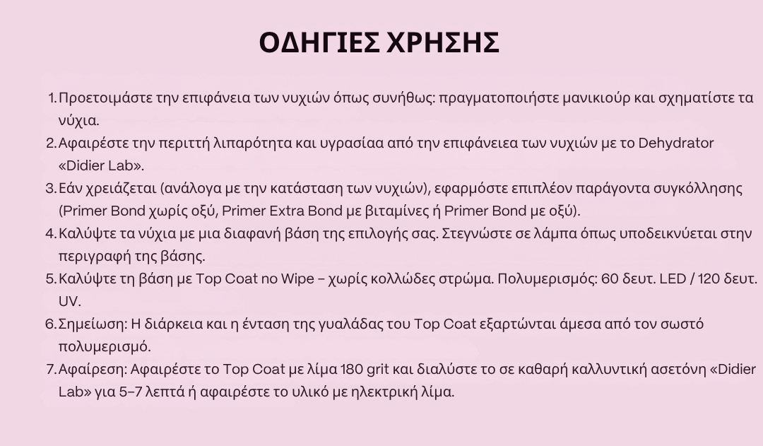 Λιμάρετε το top coat με λίμα 180 grit και έπειτα διαλύστε το με καθαρό ασετόν της "Didier Lab" για 5-7 λεπτά ή αφαιρέστε το υλικό με τροχό ή λίμα.